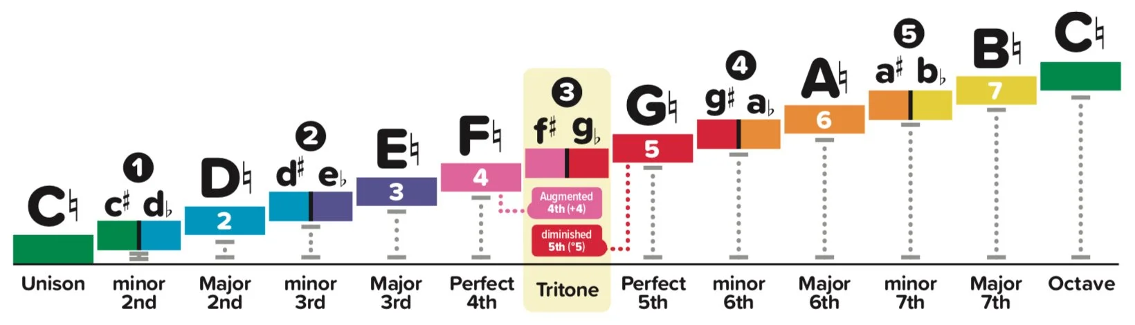 The Octave in music (here shown above for note C) is divided into 12 equal Semitones (the smallest space between two notes). This is the same as 12 equal Halftones or half steps. Each half step going up or down is one Semitone (a Halftone), and two (2) Halftones equals one (1) Wholetone. In the graphic, the distance in semitones between two notes, in this case from C to another note above it, is called an Interval. These can be from Unisons (two identical sounding C notes played at the same time) to 2nds (like C to D and C to D flat), or 3rds (like C to E), and so on. The Tritone, or halfway in any Octave, is known as a diminished 5th (°5), which is a Perfect 5th lowered by one semitone, and an Augmented 4th (+4), a Perfect 4th raised by one semitone. Now, you can see and play these intervals on your musical instrument.
