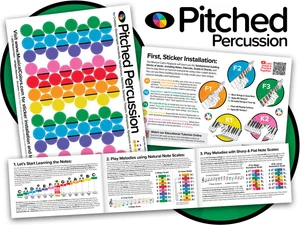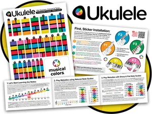 Implementing and knowing how musical notes appear in music notation using our color-coded Standard Music Notation system, can increase student interaction and proficiency, and improve the “at a slight distance” legibility of larger format scores, all while remaining sonically consistent. All notes are color coded to facilitate their identification as well as their practical realization on musical instruments that have been installed with Musical Colors color coded sticker guides.