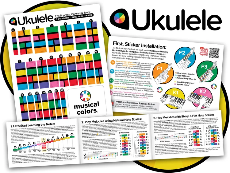 Use these Custom Color Coded Ukulele Fretboard Stickers for 4 string tenor, soprano & concert ukuleles (includes Sticker Installation instructions sheet & our 6 page Notes Playbook trifold on getting started playing musical Notes, Scales and Chords). Designed for instruments with neck widths (at the nut) of at least 32mm or more.